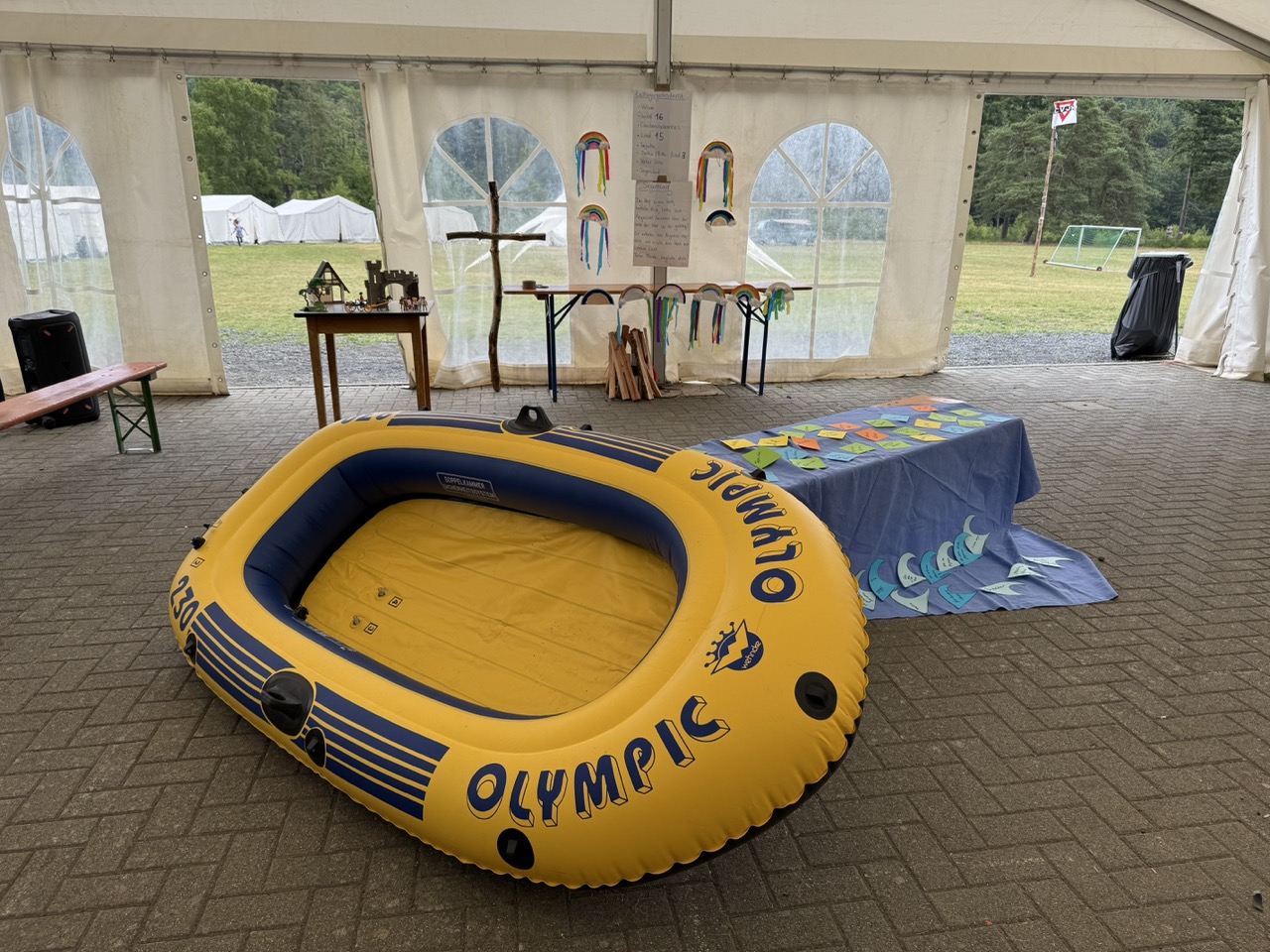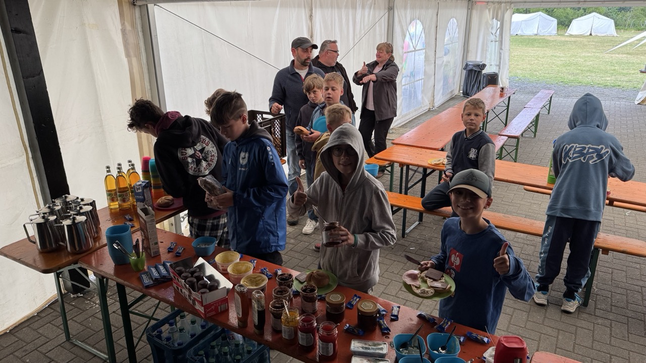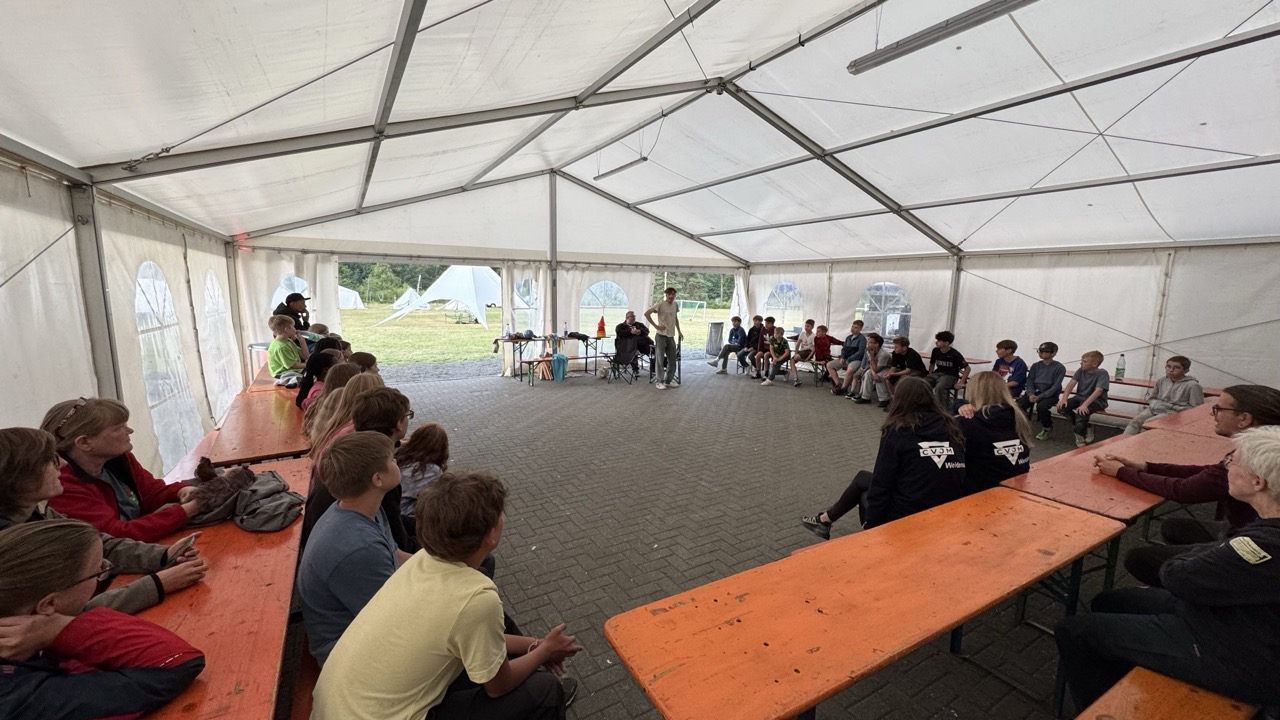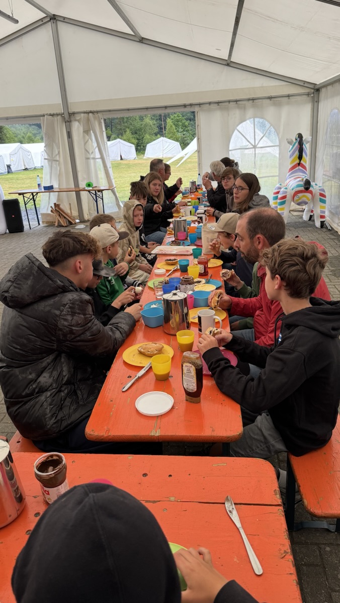 Geweckt wurden wir morgens noch mit Regen und so ging es zur Morgenwache diesmal nicht an den Fahnenmast, sondern direkt ins Essenzelt, wo wir vor dem leckeren Frühstück noch eine Morgenandacht gehört haben.