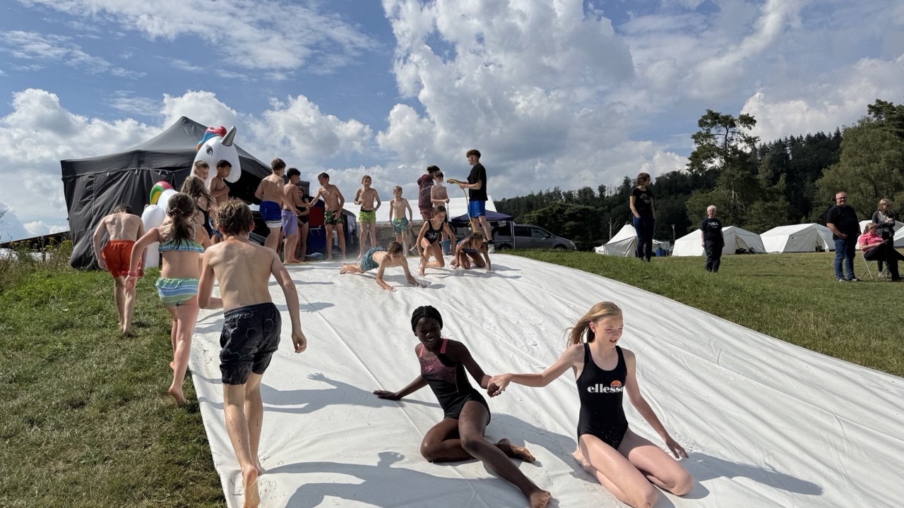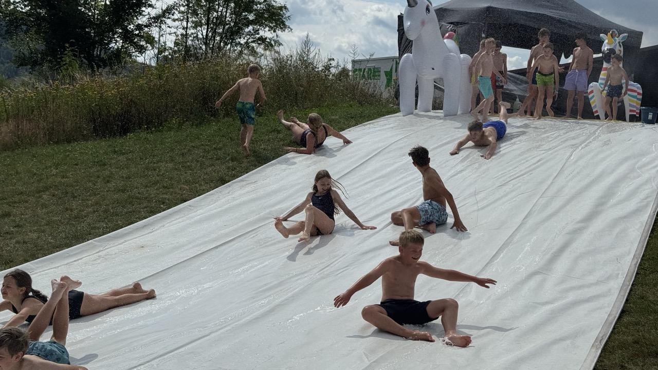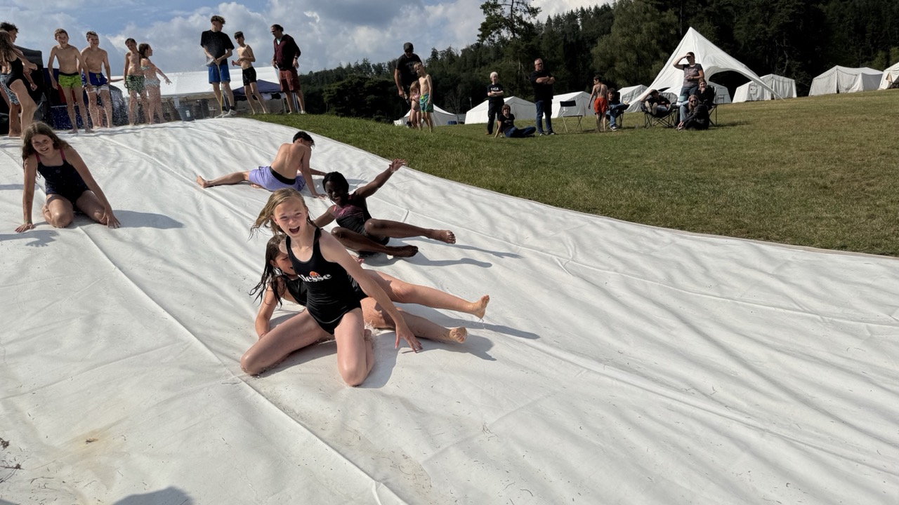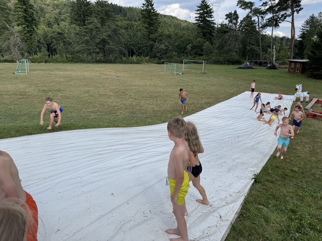 Zurück im Lager gab es erst eine etwas verspätete Mittagsruhe und anschließend wurde bei tollem Sonneschein die Wasserrutsche eröffnet.