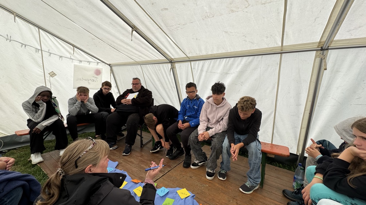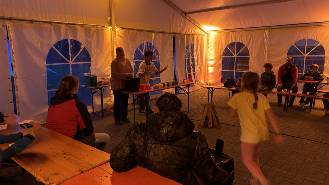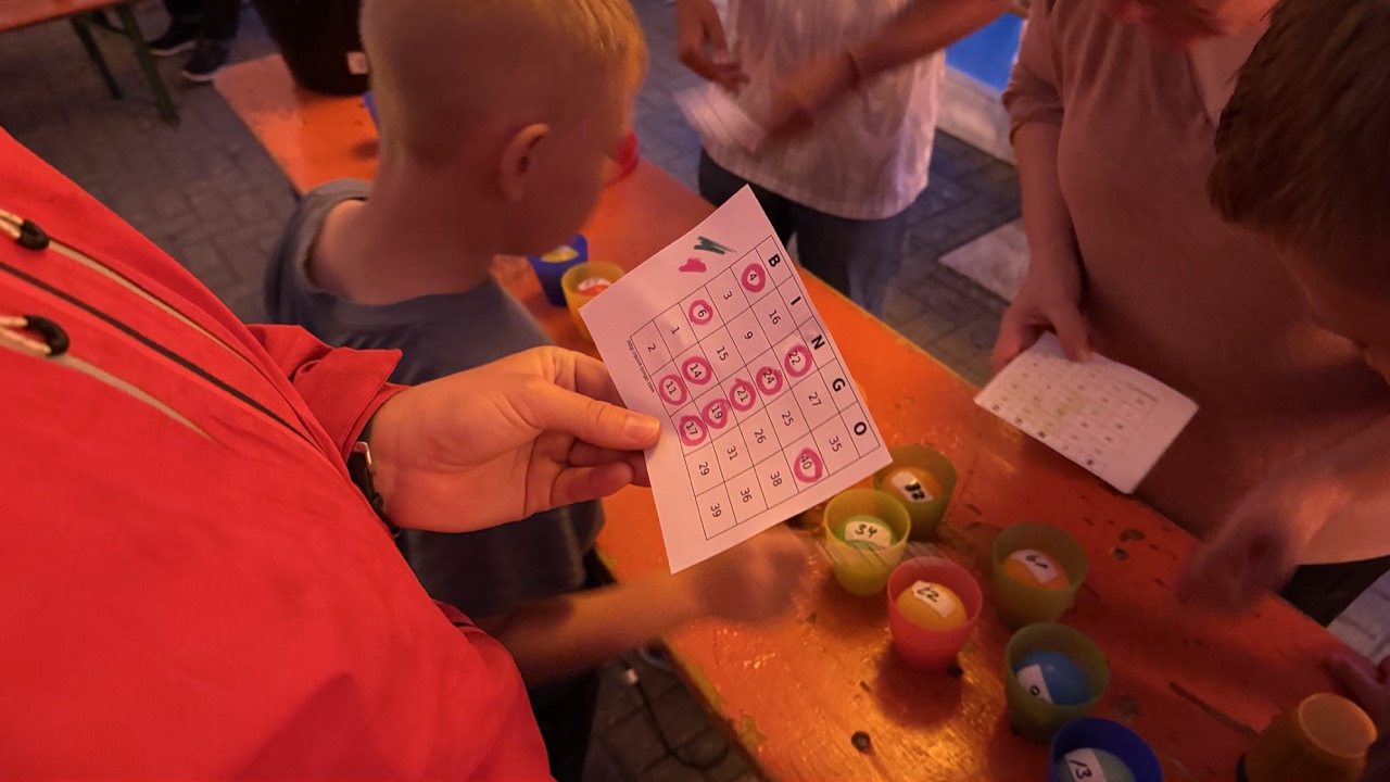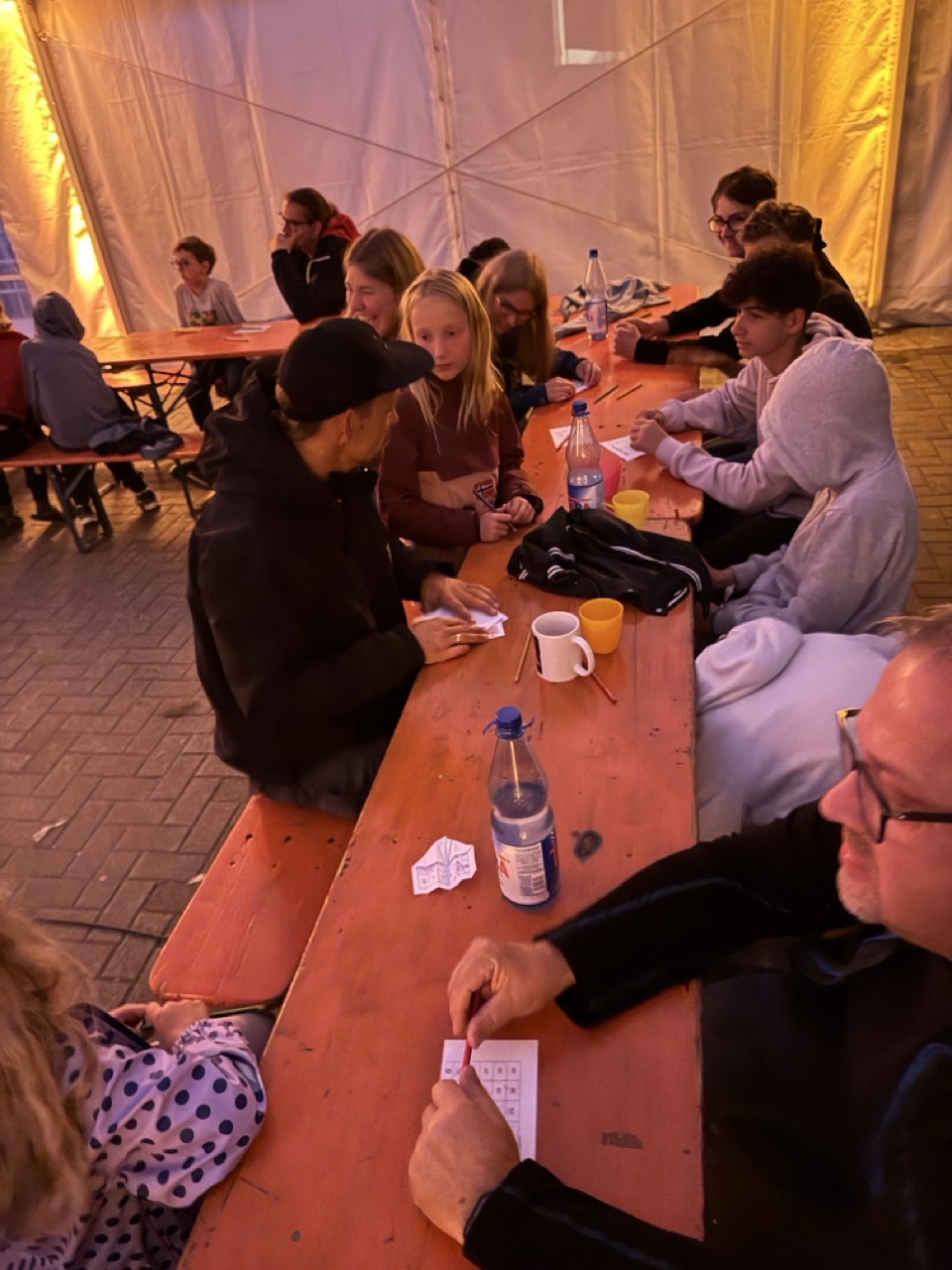 Da es Abends regnete haben wir Bingo gespielt und unsere Lagerfeuer-Runde im großen Essenzelt gemacht.